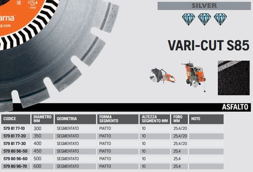 Disco Diamantato Hva 400 Vari-Cut S85 Asfalto Husqvarna La gamma Vari-Cut di lame diamantate e' la nostra categoria intermedia o Silver Questa ca...