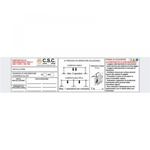 CSC EdiliziaTarghetta alluminio 40×170 mm Linea Vita Light CSC RIFERIMENTI NORMATIVI – Decreto Legislativo n°81 del 9 Aprile 2008 s.m.i. Tutela della salute e...