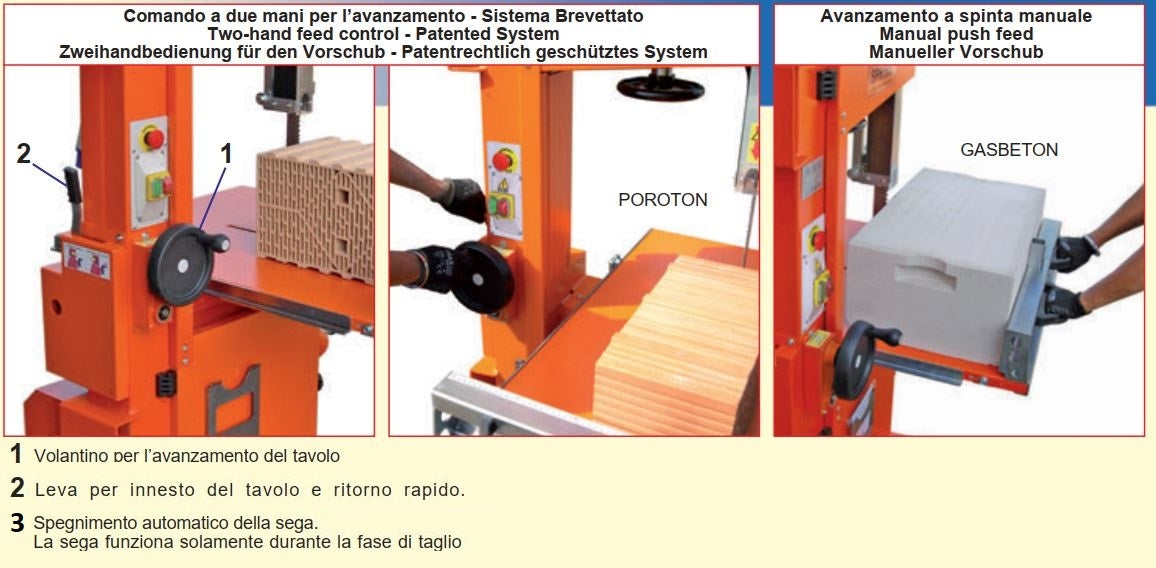 Precisione nel taglio con avanzamento controllato tramite volantino con sgancio rapido per il ritorno veloce del tavolo