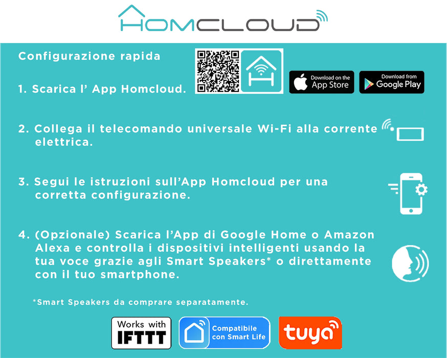 App di controllo Homcloud scaricabile gratuitamente da App Store o Google Play (compatibile anche con App Smart Life).